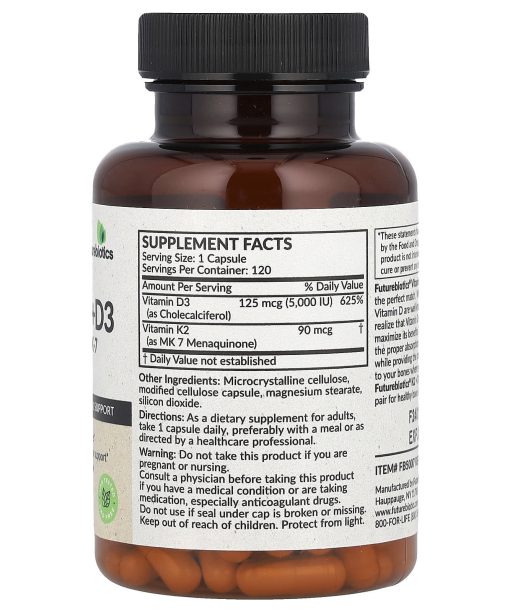 Vitamin K2 as MK-72 in 1 SupportSupports Strong BonesHealthy Cardiovascular SupportFree of Gluten and SoyDietary SupplementGMO Free – Lab TestedFuturebiotics® Vitamins K2 + D3 supplies the perfect match. While the benefits of Vitamin D are well known, many don’t realize that Vitamin D needs Vitamin K2 to maximize its benefits. This formula helps the proper absorption of calcium with D3, while providing the correct distribution to your bones where you need it most. Futurebiotics® K2 + D3 are truly the perfect pair for healthy bone & heart support.