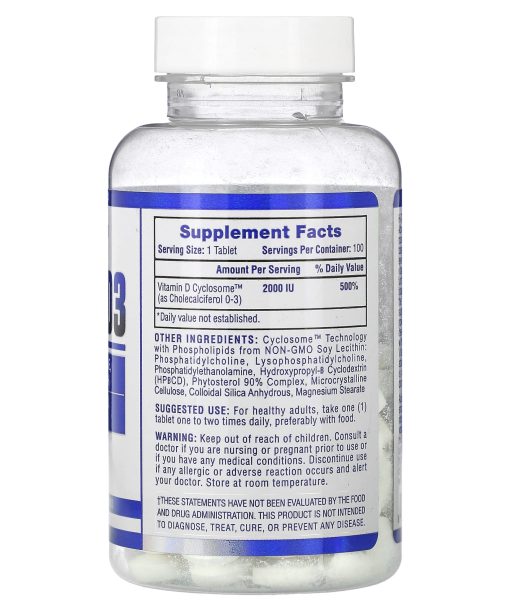 Cyclosome Delivery™ For Enhanced Bioavailabillty2,000 IU Per TabletSupports Muscle, Bone, Tooth & Immune HealthThe Body’s Preferred Form of Vitamin DGMP Quality AssuredNon-GMODietary SupplementHi-Tech Pharmaceuticals Vitamin D3 utilizes Advanced Cyclosome™ Technology creating the most advanced Vitamin D3 complex available today with a vortex of solubility on a microscopic level for increased absorption and a more effective vitamin. We took liposomal technology a step further and enhanced solubility for maximum bioavailability. Vitamin D3, often referred to as the “Sun Vitamin”, is an essential nutrient that supports the immune system, strength and power in muscles, helps calcium absorption to develop strong bones and teeth, and helps with overall well-being and mood. Combining Vitamin D3 with other nutrients supports absorption in the body as well. Vitamin D3 is versatile and pretty important stuff, so don’t get low!Advanced Cyclosome™ delivery technology encompasses naturally derived Vitamin D3 into a liposome hydrophilic complex to create a vortex of enhanced solubility and optimal bioavailability. Cyclosome™ liposomal delivery utilizes natural ingredients to preserve the high quality Vitamin D3 ingredient through digestion, protecting the active ingredient, while increasing bioavailability.