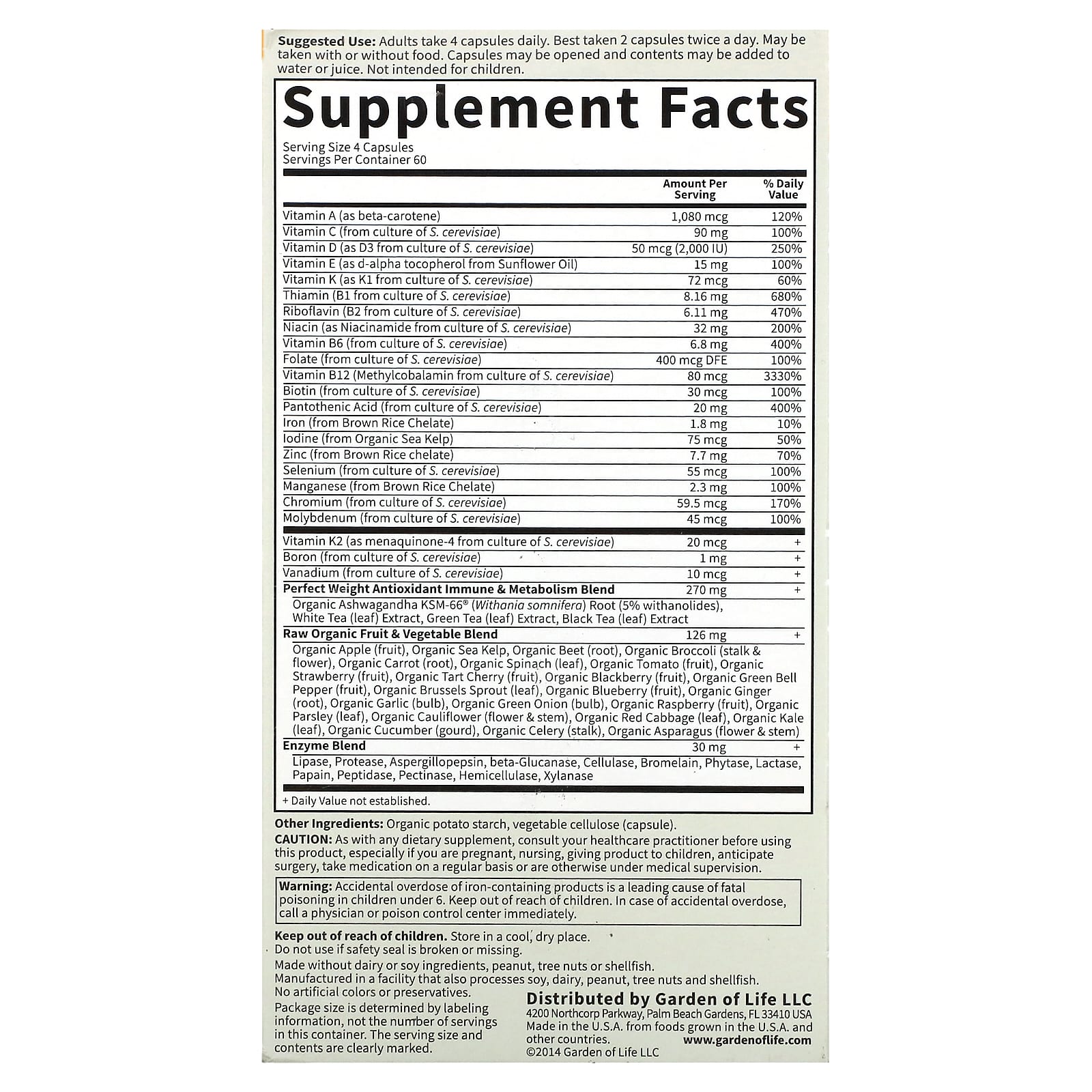 Raw Whole Food  SupplementDigestive Enzymes23 Organically Grown Fruits & VeggiesNo Binders or FillersWhole Food MultivitaminHealthy Metabolism & Stress ManagementNon GMO Project VerifiedNSF Certified Gluten-FreeKosherDietary SupplementCertified B CorporationWhat RAW MeansNo high heat, synthetic binders, fillers, artificial flavors, sweeteners, colors or additives commonly used in tablets.Non-GMO VerifiedIndependent, third party verification.Certified Gluten-Free by NSFB-CorpCertified by the nonprofit B Lab to meet rigorous standards of social and environmental performance, accountability and transparency.Vitamin Code® Perfect Weight™ is a comprehensive whole food multi-nutrient formula, specifically formulated to meet the unique needs of men and women actively managing their weight, providing the nourishment the body craves to maintain optimal health and well-being.23 powdered organically grown fruits and vegetables add supporting antioxidants, vitamins and nutrient cofactors.Powerful Ayurvedic Ashwagandha to Support Stress ManagementMental and Physical EnergyHealthy MetabolismEnzymes Support Healthy Digestion