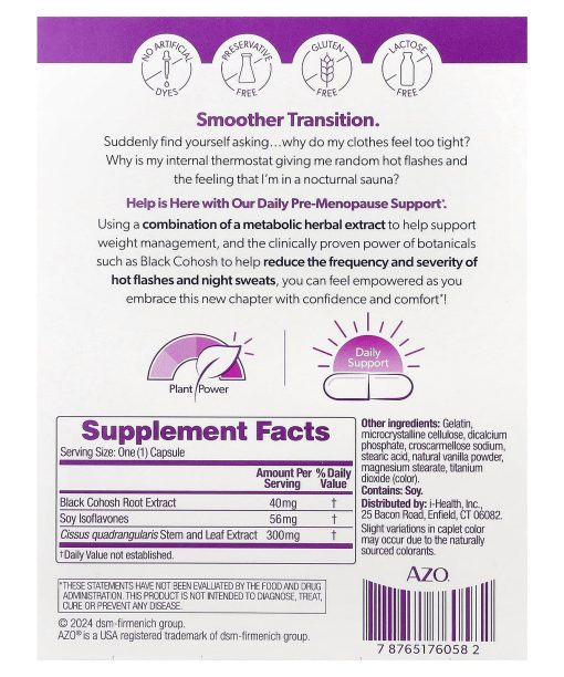 Clinically Proven IngredientsDaily Pre-Menopause SupportHot FlashesNight SweatsWeight ManagementDietary SupplementNo Artificial DyesPreservative FreeGluten FreeLactose FreePlant PowerBacked by Science &Committed to Quality Women’s Health ProductsSmoother Transition. Suddenly find yourself asking… why do my clothes feel too tight? Why is my internal thermostat giving me random hot flashes and the feeling that I’m in a nocturnal sauna? Help is Here with Our Daily Pre-Menopause Support.Using a combination of a metabolic herbal extract to help support weight management, and the clinically proven power of botanicals such as Black Cohosh to help reduce the frequency and severity of hot flashes and night sweats, you can feel empowered as you embrace this new chapter with confidence and comfort!