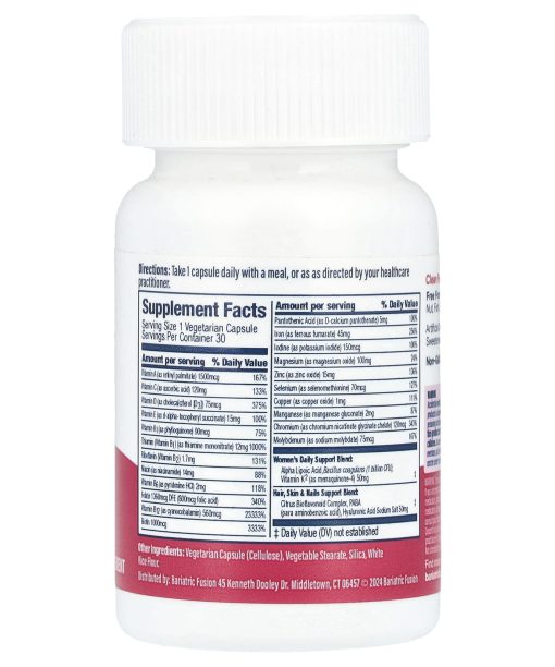 With 45 mg IronOne Per Day CapsuleDietary SupplementClean FormulationNon-GMOWomen’s One Per Day Bariatric Multivitamin Capsule with Iron (45mg) is the first women’s-specific multivitamin formula with targeted botanicals and ASMBS-recommended nutrients to support women’s health and wellness after bariatric surgery.