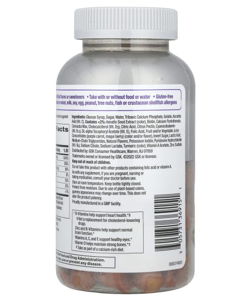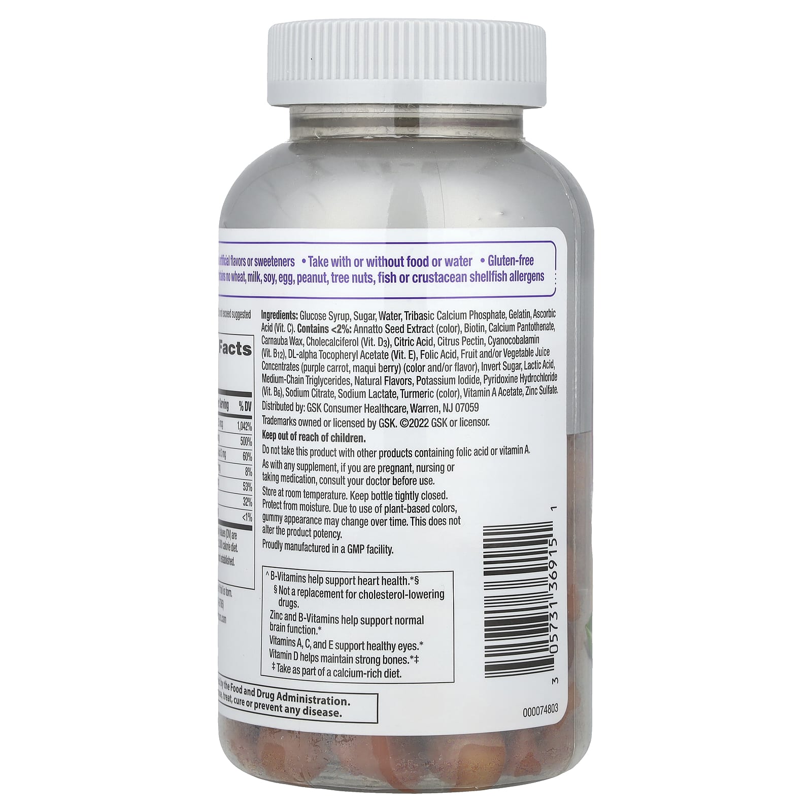 Glucose syrup, sugar, water, tribasic calcium phosphate, gelatin, ascorbic acid (vit. c). Contains <2% of: annatto seed extract (color), biotin, calcium pantothenate, carnauba wax, cholecalciferol (vit. d3), citric acid, citrus pectin, cyanocobalamin (vit. b12), dl-Alpha tocopheryl acetate (vit. e), folic acid, fruit and/or vegetable juice concentrates (purple carrot, maqui berry) (color and/or flavor), invert sugar, lactic acid, medium-chain triglycerides, natural flavors, potassium iodide, pyridoxine hydrochloride (vit. b6), sodium citrate, sodium lactate, turmeric (color), vitamin a acetate, zinc sulfate.Contains no wheat, milk, soy, egg, peanut, tree nuts, fish or crustacean shellfish allergens.Proudly manufactured in a GMP facility.