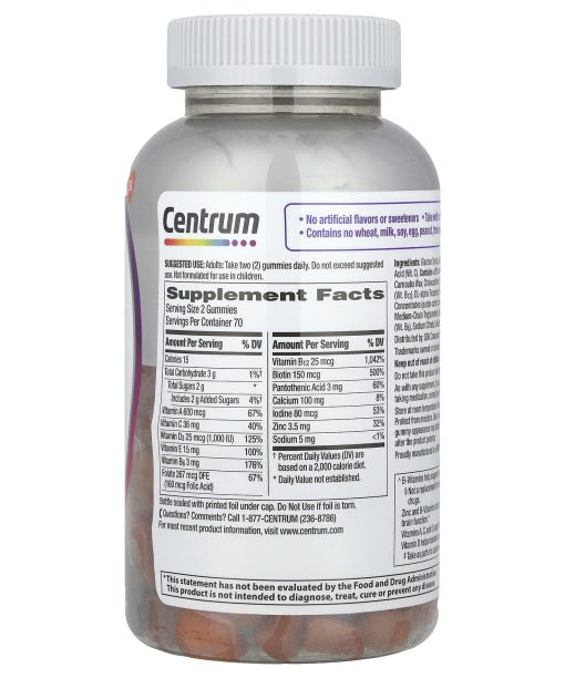 Bottled sealed with printed foil under cap. Do not use if foil is torn.Keep out of reach of children. Do not take this product with other products containing folic acid or vitamin A. As with any supplement, if you are pregnant, nursing, or taking medication, consult your doctor before use.Store at room temperature. Keep bottle tightly closed. Protect from moisture. Due to use plant-based colors, gummy appearance may change over time. This does not alter the product potency.