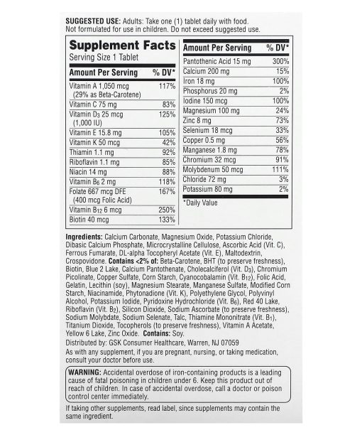 Calcium carbonate, magnesium oxide, potassium chloride, dibasic calcium phosphate, microcrystalline cellulose, ascorbic acid (vit. c), ferrous fumarate, dl-alpha tocopheryl acetate (vit. e), maltodextrin, crospovidone. contains <2% of: beta-carotene, bht (to preserve freshness), biotin, blue 2 lake, calcium pantothenate, cholecalciferol (vit. d3), chromium picolinate, copper sulfate, corn starch, cyanocobalamin (vit. b12), folic acid, gelatin, lecithin (soy), magnesium stearate, manganese sulfate, modified corn starch, niacinamide, phytonadione (vit. k), polyethylene glycol, polyvinyl alcohol, potassium iodide, pyridoxine hydrochloride (vit. b6), red 40 lake, riboflavin (vit. b2), silicon dioxide, sodium ascorbate (to preserve freshness), sodium molybdate, sodium selenate, talc, thiamine mononitrate (vit. b1), titanium dioxide, tocopherols (to preserve freshness), vitamin a acetate, yellow 6 lake, zinc oxide. Contains: Soy.