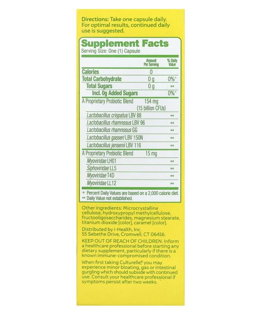 Keep out of reach of children. Inform a healthcare professional before starting any dietary supplement, particularly if there is a known immune-compromised condition. When first taking Culturelle® you may experience minor bloating, gas or intestinal gurgling which should subside with continued use. Consult your healthcare professional if symptoms persist after two weeks.Storage Instructions:  Store Culturelle® in a cool, dry place away from direct sunlight.Tamper Evident:  Do not use this product if safety seal is bearing “sealed for your protection” under cap is missing or torn.