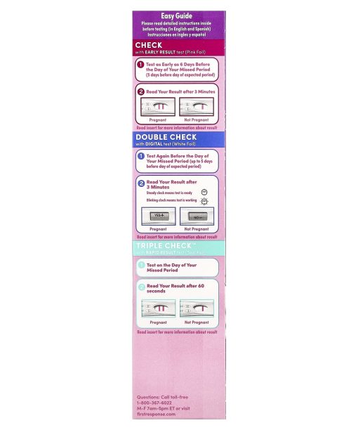 Easy Guide – Please read detailed instructions inside before testing.Check with Early Result Test (Pink Foil)Test as early as 6 days before the day of your missed period (5 days before day of expected period)Read your result after 3 minutes Read insert for more information about result.Double Check with Digital Test (white foil)Test again before the day of your missed period (up to 5 days before day of expected period)Read your result after 3 minutes. Steady clock means test is ready.Blinking clock means test is working.Read insert for more information about result.Triple Check™ with Rapid Result Test (Teal foil)Test on the day of your missed periodRead your result after 60 seconds Read insert for more information about result.