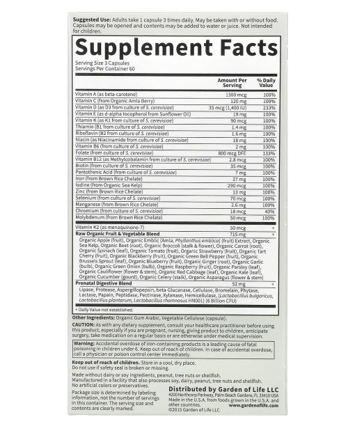 Whole Food MultivitaminNutritional Support For Mom & BabyNon GMO Project VerifiedNSF Certified Gluten-FreeDietary SupplementKosherWhat Raw Means – No high heat, synthetic binders, fillers, artificial flavors, sweeteners, colors or additives commonly used in tablets.Non-GMO Verified – Independent, third party verification.B-Corp – Certified by the nonprofit B Lab to meet rigorous standards of social and environmental performance, accountability and transparency.Vitamin Code® Raw Prenatal™ is a comprehensive whole food multi-nutrient formula, specifically formulated to meet the unique needs of women during pre-conception, pregnancy and lactation, providing the nourishment to support both mom and her developing baby.23 Powdered organically grown fruits and vegetables add supporting antioxidants, vitamins and nutrient cofactors.800 mcg Folate to Support Healthy Neural Tube Development27 mg Stomach-Friendly Iron for Blood and Reproductive System Health1,400  IU Vitamin D3 for Optimal Dietary Calcium AbsorptionProbiotic Immune System Support for Mom and Baby