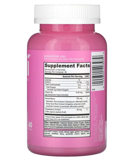 Chasteberry ExtractDong Quai, Dandelion, Lavender & Vitamin B6Dietary SupplementGluten FreeNon-GMOGelatin-FreeVeganMade with chasteberry extract to help relieve:Mood SwingsBreast TendernessIrritabilityGoli® Women’s PMS Relief Gummies When PMS symptoms strike, it can be tricky to go with the flow, so to speak. Luckily, these delicious little gummies contain Chasteberry to help with some of the pre-menstruation frustration not-so-lovingly known as PMS. We’re talking relief for your mood swings & irritability. Breast tenderness? Ta-ta for now! We also added Vitamin B6 to support nervous system health too. So ladies, don’t let PMS run the show. Period.Goli® Nutrition is an inventive, people-focused nutrition company driven by the belief that happiness and wellness go hand in hand. We strive to provide innovative products, uniquely formulated with complementary ingredients all backed by science, in a delivery format that makes taking your daily supplements enjoyable!