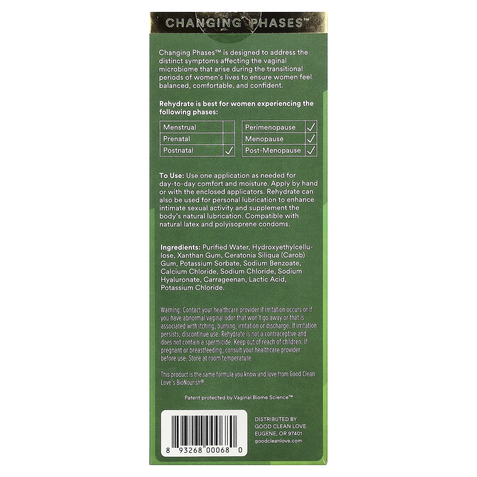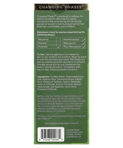 Changing Phases™With Hyaluronic AcidHelps Relieve Symptoms of Dryness, Odor and DiscomfortBio-Match® TechnologyCertified B CorporationWorks the Way You Do®Good Clean Love makes vaginal wellness products that support a healthy vaginal microbiome. Rehydrate Vaginal Moisturizer is: Ultra moisturizing with hyaluronic acid to support the integrity of the vaginal tissue Water-based for ultra sensitive tissue Gynecologist- recommended* Free of estrogen, parabens glycerin, or added fragrance Does not disrupt healthy vaginal tissue Good Clean Love is a certified B-corp using recyclable bio-plastic sugar cane tubes as part of its commitment to sustainability. What is Bio-Match®? A 3-layer stacked patented technology supporting optimal vaginal microbiome health.Iso-osmotic protects and stabilizes vaginal moisture pH-balances lowers pH to optimal range for healthy bacteria to thriveProprietary lactic acid blend nourishes a diverse range of healthy lactobacilliChanging Phases™ is designed to address the distinct symptoms affecting the vaginal microbiome that arise during the transitional periods of women’s lives to ensure women feel balanced, comfortable, and confident. Rehydrate is best for women experiencing the following phases:PostnatalPerimenapauseMenopausePost-Menopause*among gynecologists aware of the brand in a national survey.