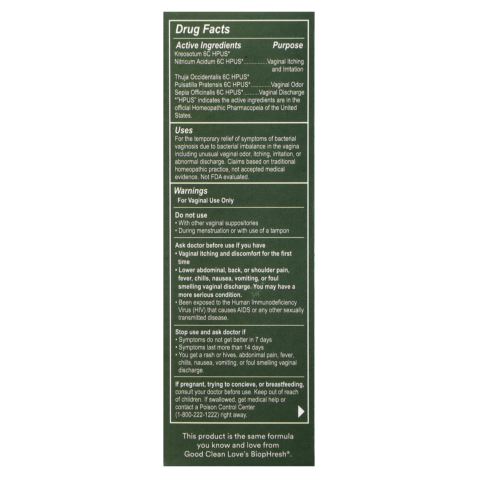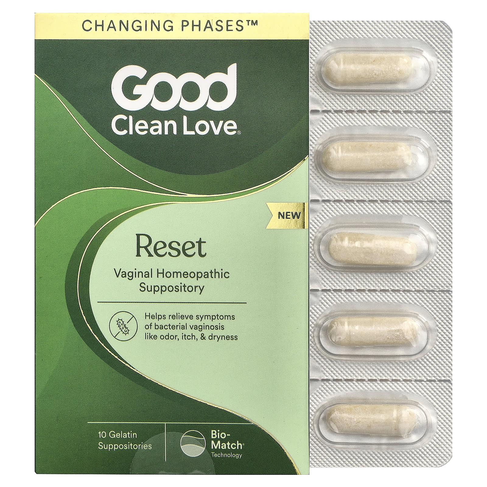 Changing Phases™Bio-Match® Technology Works The Way You Do®Certified B CorporationHelps relieve symptoms of bacterial vaginosis like odor, itch, & dryness.This product is the same formula you know and love from good clean Love’s BiopHresh®.Changing Phases™ is designed to address the distinct symptoms affecting the vaginal microbiome that arise during the transitional periods of women’s lives to ensure women feel balanced, comfortable, and confident. Reset is best for women experiencing the following phases:MenstrualPrenatalPostnatalPerimenopauseMenopausePost-MenopauseReset Vaginal Suppository: Helps restore healthy vaginal flora Promotes urinary tract health Lowers vaginal pH Contains 5 billion live lactobacilli per capsule Is gynecologist-recommended*What is Bio-Match®? A 3-layer stacked patented technology supporting optimal vaginal microbiome health Iso-osmotic protects and stabilizes vaginal moisturepH-balances lowers pH to optimal range for healthy bacteria to thriveProprietary lactic acid blend nourishes a diverse range of healthy lactobacilliUses: For the temporary relief of symptoms of bacterial vaginosis due to bacterial imbalance in the vagina including unusual vaginal odor, itching, irritation, or abnormal discharge. Claims based on traditional homeopathic practice, not accepted medical evidence. Not FDA evaluated.*Among gynecologists aware of the brand in a national survey