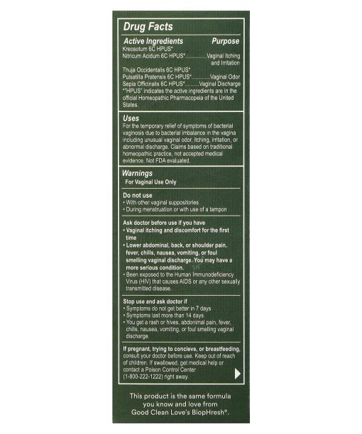 Drug FactsActive IngredientsPurposeKreosotum 6c HPUS*Nitricum Acidum 6C HPUS*Thuja Occidentalis 6C HPUS*Pulsatilla Pratensis 6C HPUS*Sepia Officinalis 6C HPUS* Vaginal Itching and Irritation Vaginal OdorVaginal Discharge *”HPUS” indicates the active ingredients are in the official Homeopathic Pharmacopeia of the United States.Inactive IngredientsAscorbic acid, gelatin, lactobacillus acidophilus la02, lactobacillus crispatus lcr01, lactobacillus gasseri lgs06, limosilactobacillus fermentum lf08, lactiplantibacillus plantarum lp01, lacticaseibacillus rhamnosus lr06, ligilactobacillus salivarius crl 1328, maltodextrin, tapioca starch.