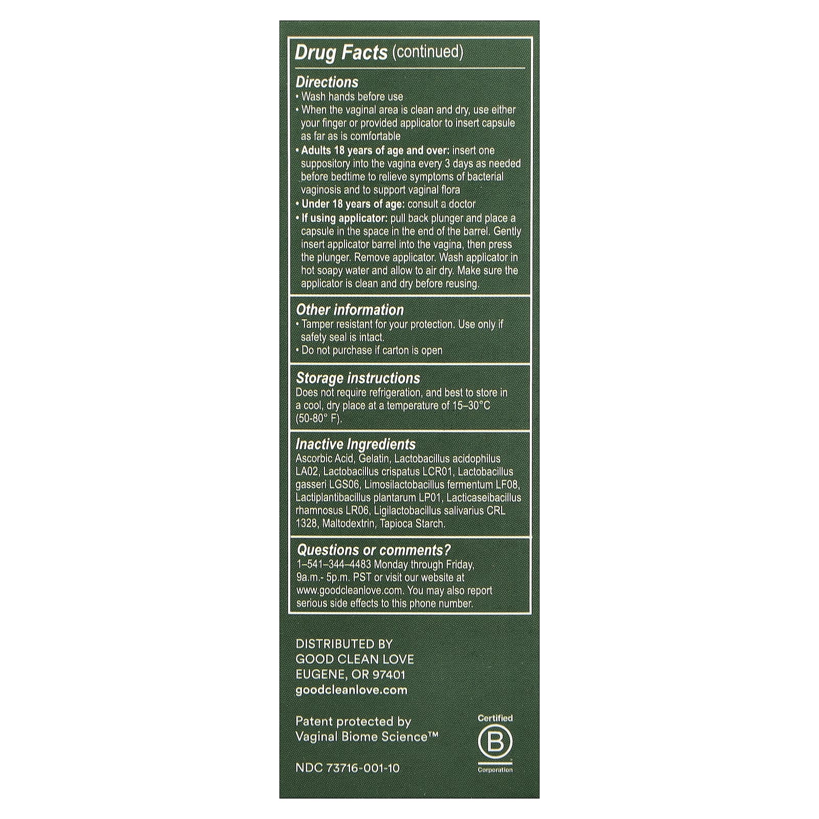 Wash hands before useWhen the vaginal area is clean and dry, use either your finger or provided applicator to insert capsule as far as is comfortableAdults 18 years of age and over: insert one suppository into the vagina every 3 days as needed before bedtime to relieve symptoms of bacterial vaginosis and to support vaginal floraUnder 18 years of age: consult a doctorIf using applicator: Pull back plunger and place a capsule in the space in the end of the barrel. Gently insert applicator barrel into the vagina, then press the plunger. Remove applicator. Wash applicator in hot soapy water and allow to air dry. Make sure the applicator is clean and dry before reusing
