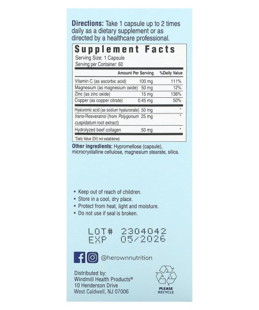 Dietary SupplementNon-GMOGluten FreeSoy FreeNo Synthetic Colors or PreservativesSuper skin hydration from the inside out. Nourishes and protects skin while building essential collagen.Beauty from Within Beauty Supports:Skin ElasticityRetain MoistureAntioxidant benefitsFine lines & wrinklesWe create essential health supplements formulated for the modern woman’s everyday needs. Her Own™ is women’s wellness, evolved.Hyaluronic Acid Holds on to moisture which allows the skin to feel more hydrated and plump.Zinc Helps your immune system and metabolism function.Hydrolyzed Collagen Anti-aging ingredient to aid in reducing wrinkles, alleviate joint pain, improve bone health & promote weight loss.