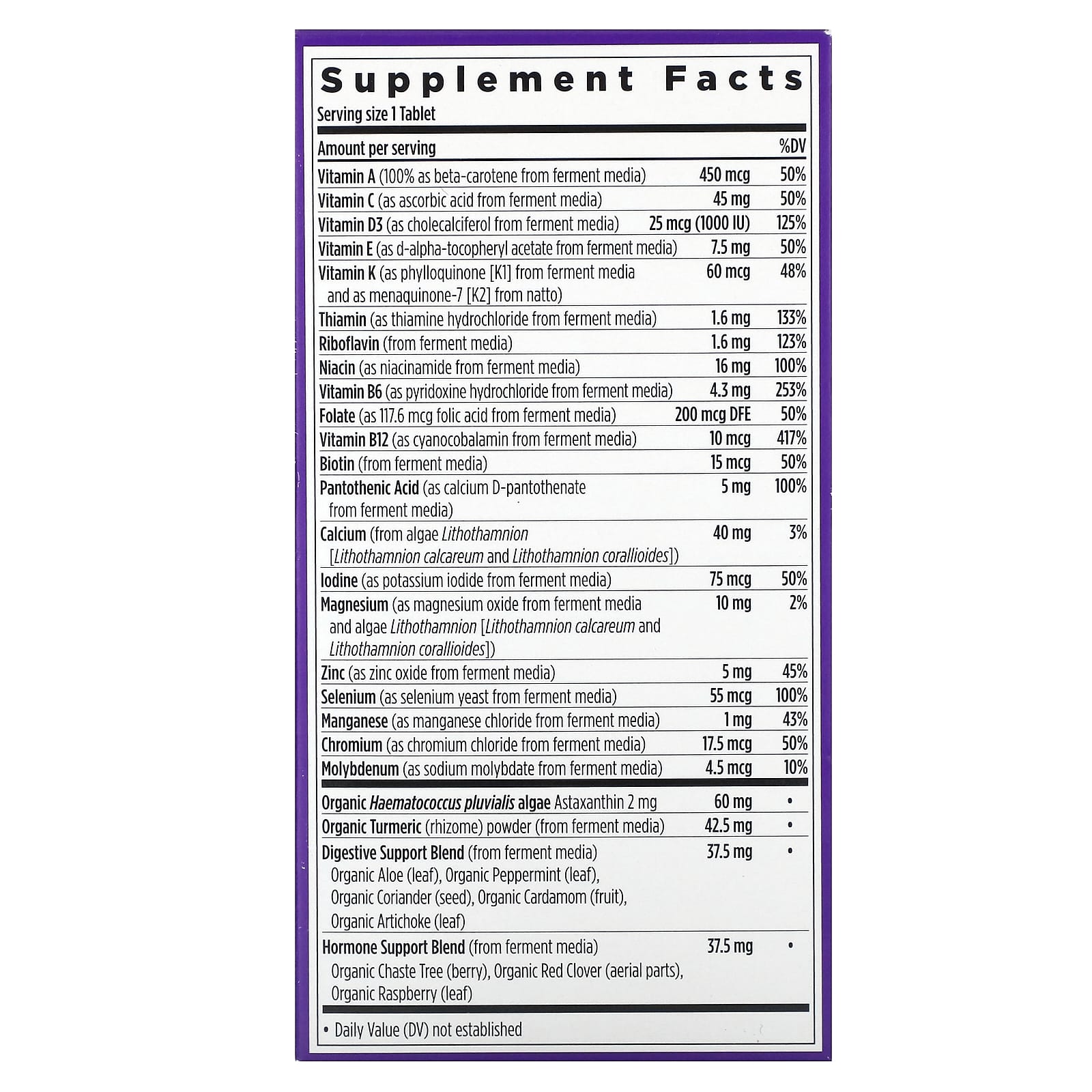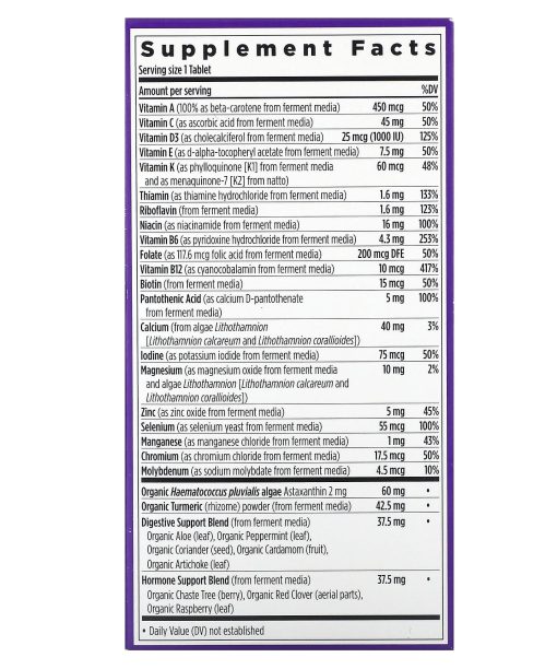 Est. 1982Formulated for AbsorptionMade with Organic Vegetables & HerbsCertified Organic by Where Food Comes From OrganicNSF Certified Gluten-FreeNon-GMO Project VerifiedKosherDietary Supplement100% VegetarianNo Artificial Flavors or ColorsCertified B CorporationWith Gratitude from VermontNutrition Crafted For: Immune, Heart, Bone & Cellular Energy Support*The Magic Inside: Essential nutrients your body can recognize, fermented & blended with superfood herbs and Astaxanthin*Complete MultivitaminFor the Needs of Women 55+Expertly formulated to support the holistic health needs of women 55+, with nutrients for brain, eye, bone & breast health support, stress, mood, vision & digestive support, and healthy hair, skin & nails.* Iron-Free.Immune & Energy BoostingSupports immune health with Vitamins C & E,† plus Astaxanthin–a rare plant-nutrient from organic algae.* 8 fermented B Vitamins promote cellular energy metabolism.*Heart Healthy Vitamin D3 supports cardiovascular health, including healthy blood pressure support.Holistic HerbsInspired by tradition and grounded in science, advanced organic botanicals include Turmeric, Red Clover and Raspberry leaf.Absorb the Good StuffWe fine-tune the levels of each high-quality vitamin & mineral, choose types that work best with the body, and ferment key nutrients with probiotics and whole foods. †Not a sole source of this nutrient; a healthy diet is also important.