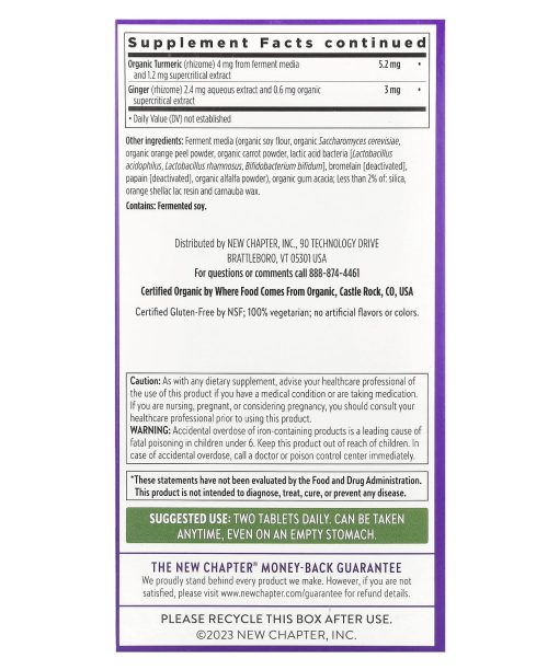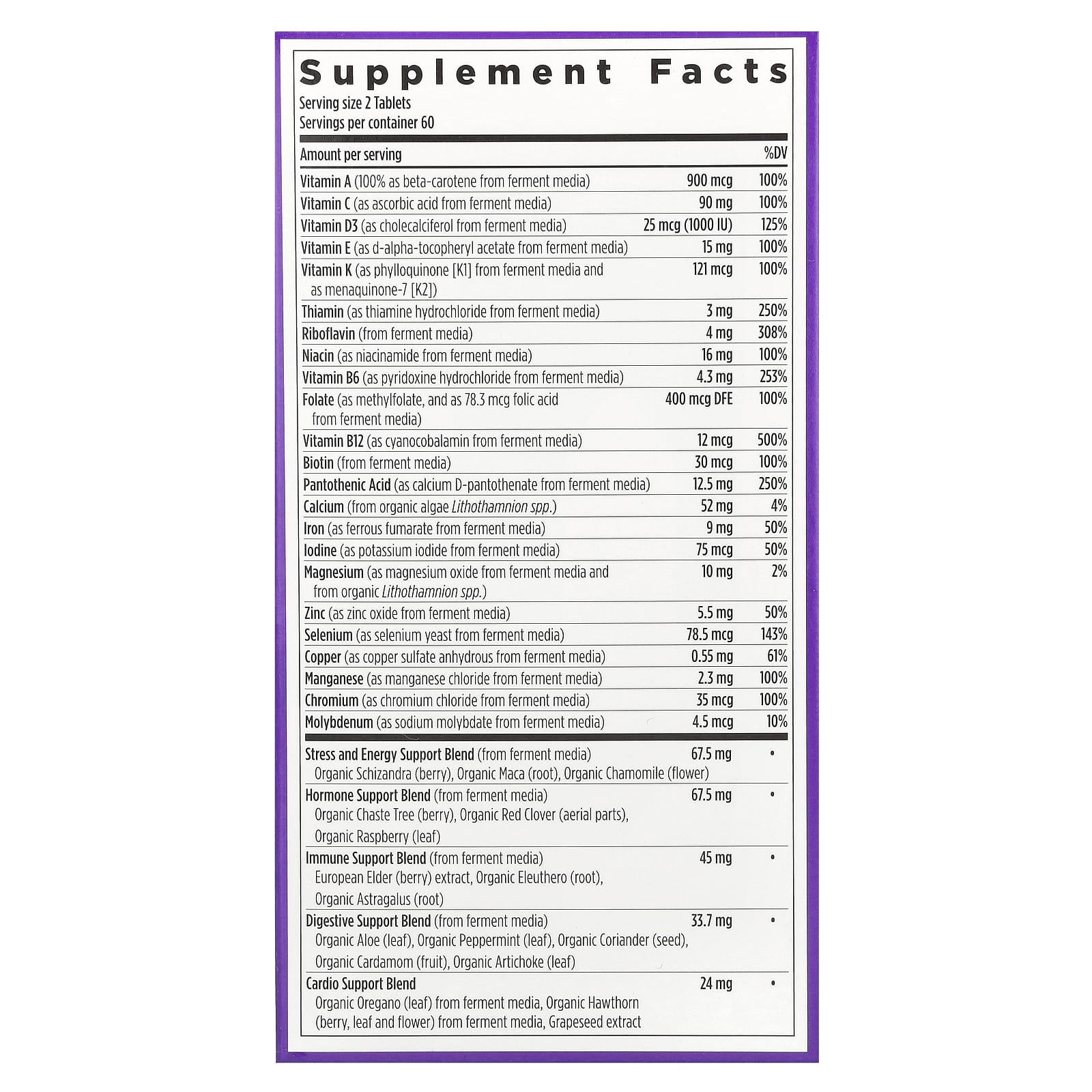 EST. 1982Formulated for AbsorptionMade with Organic Vegetables & HerbsWhere Food Comes From® OrganicNon GMO Project VerifiedCertified Gluten-Free by NSFKosherDietary SupplementCertified Organic by Where Food Comes From Organic100% VegetarianNo Artificial Flavors or ColorsWith Gratitude from VermontCertified B CorporationNutrition Crafted for:Immune, Beauty, Energy, Stress & Bone SupportThe Magic Inside:Higher levels of essential nutrients† your body can recognize, blended with superfood herbs including Elderberry, Turmeric & MacaComplete MultivitaminNutrition-Packed for WomenComplete support for women’s overall health and system-specific benefits, with nutrients for heart, brain, vision, bone & breast health support, stress support, and healthy digestion packed into just 2 tablets a day.Immune & Energy BoostingFermented Zinc‡ and Vitamin C & A support immune system function, while 8 B Vitamins promote energy metabolism.Beauty from WithinFermented Biotin supports keratin production for healthy hair & nail growth, and Vitamin C protects collagen for firm, nourished skin.Whole-Food HerbsInspired by tradition and grounded in science, advanced botanicals include Elderberry, organic Turmeric and Red clover.Absorb the Good StuffWe fine-tune the levels of each high-quality vitamin & mineral, choose types that work best with the body, and ferment key nutrients with probiotics and whole foods.†Compare to Every Women™’s One Daily multivitamin, this formula has higher levels of Thiamin, Riboflavin, Vitamins B6 & B12, Biotin, Iron, Selenium, Manganese & Chromium.‡Not a sole source of this nutrient; a healthy diet is also important.